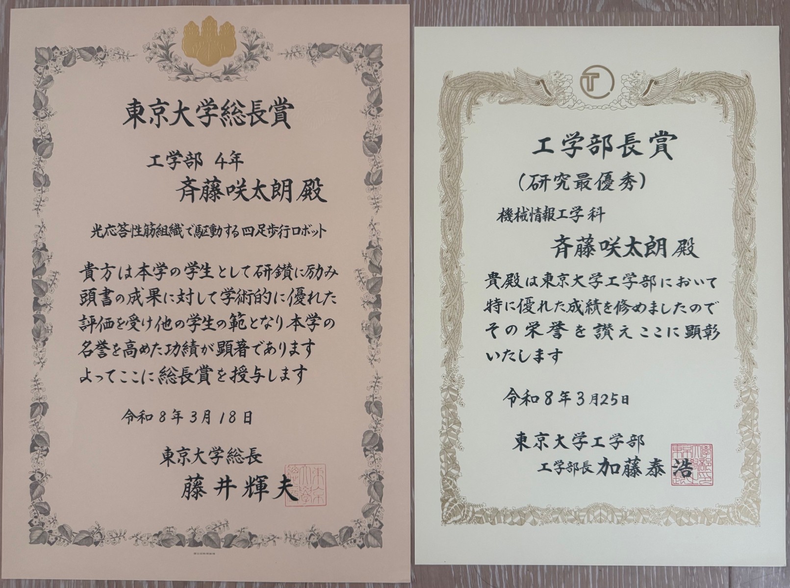 令和8年度 東京大学卒業式において、東大総長賞並びに工学部長賞を受賞しました。